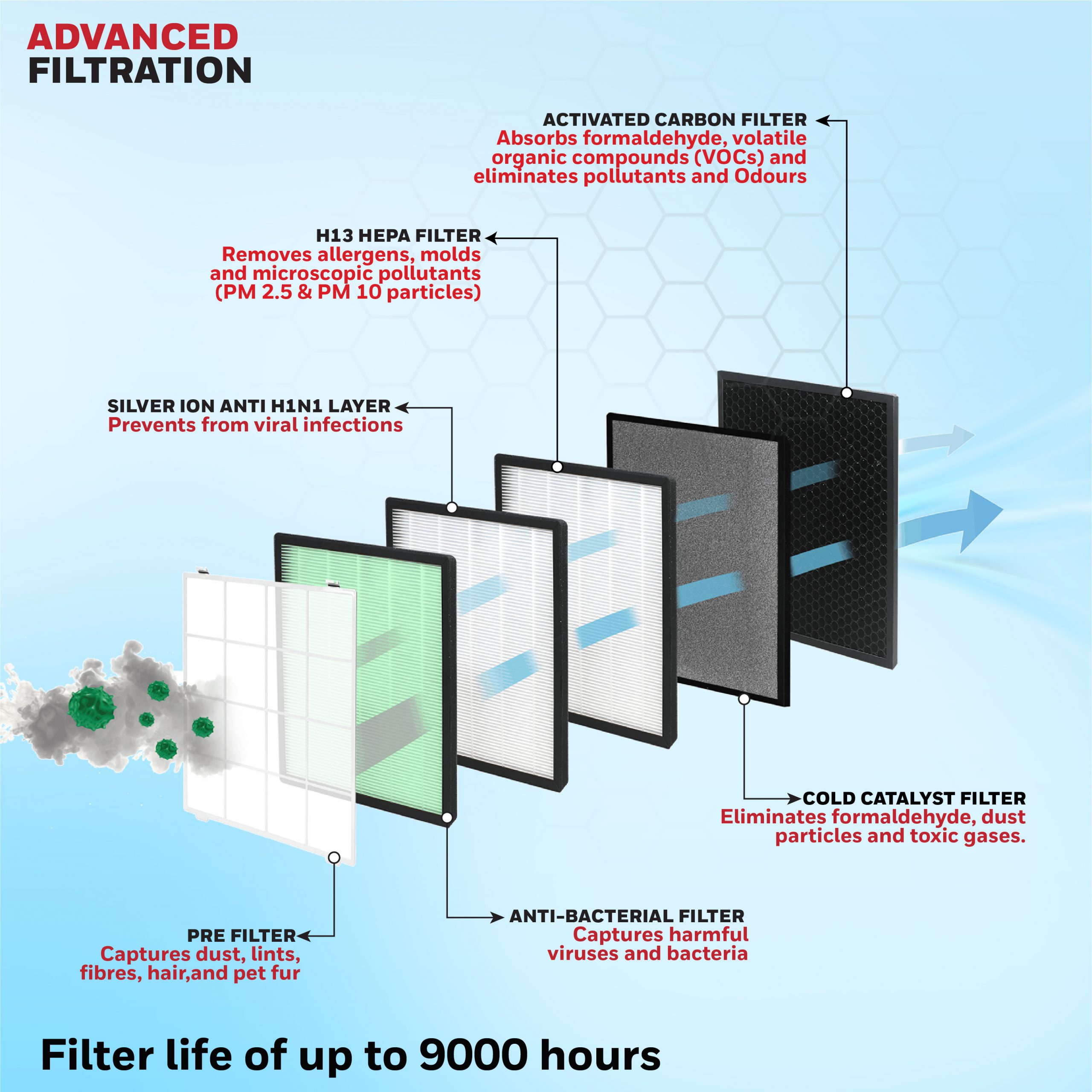 • Compound Filter 1: Anti-Bacterial Filter, Silver Ion and H13 HEPA Filter