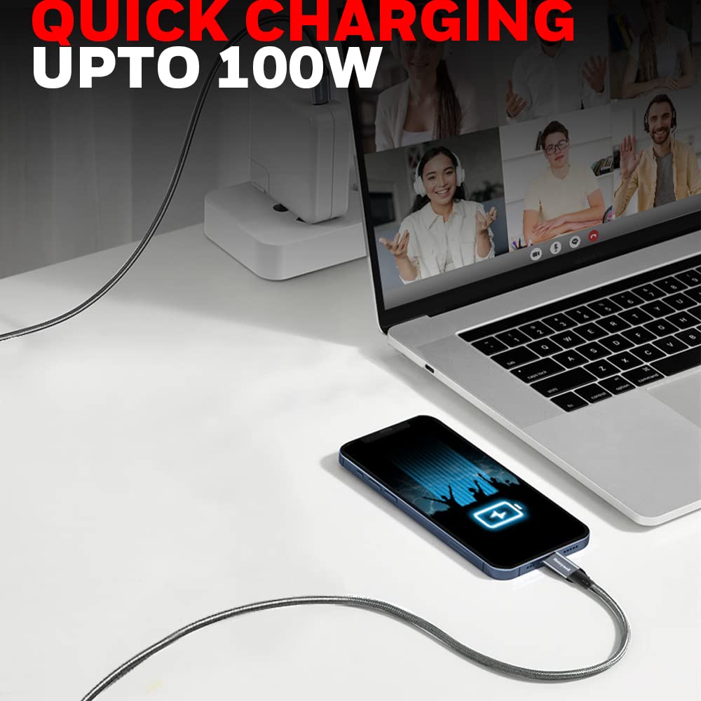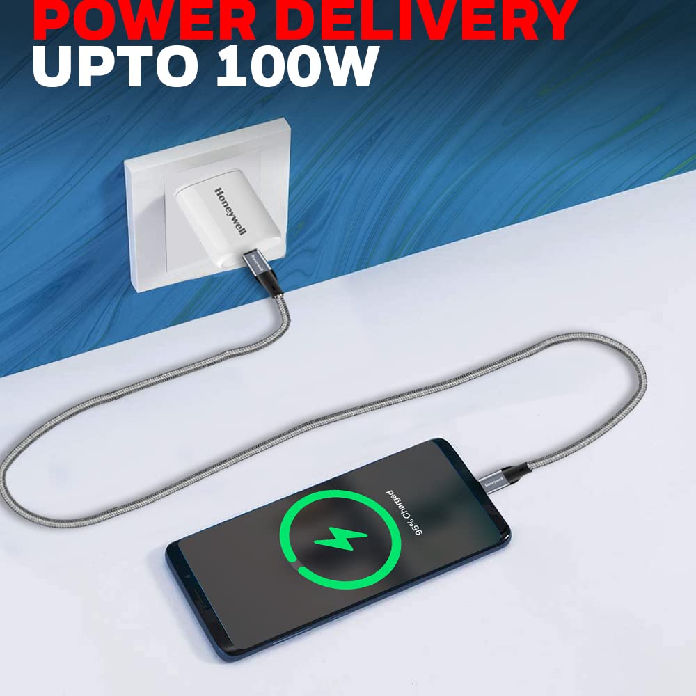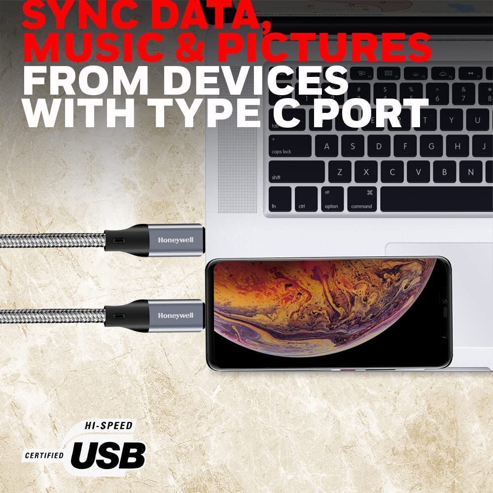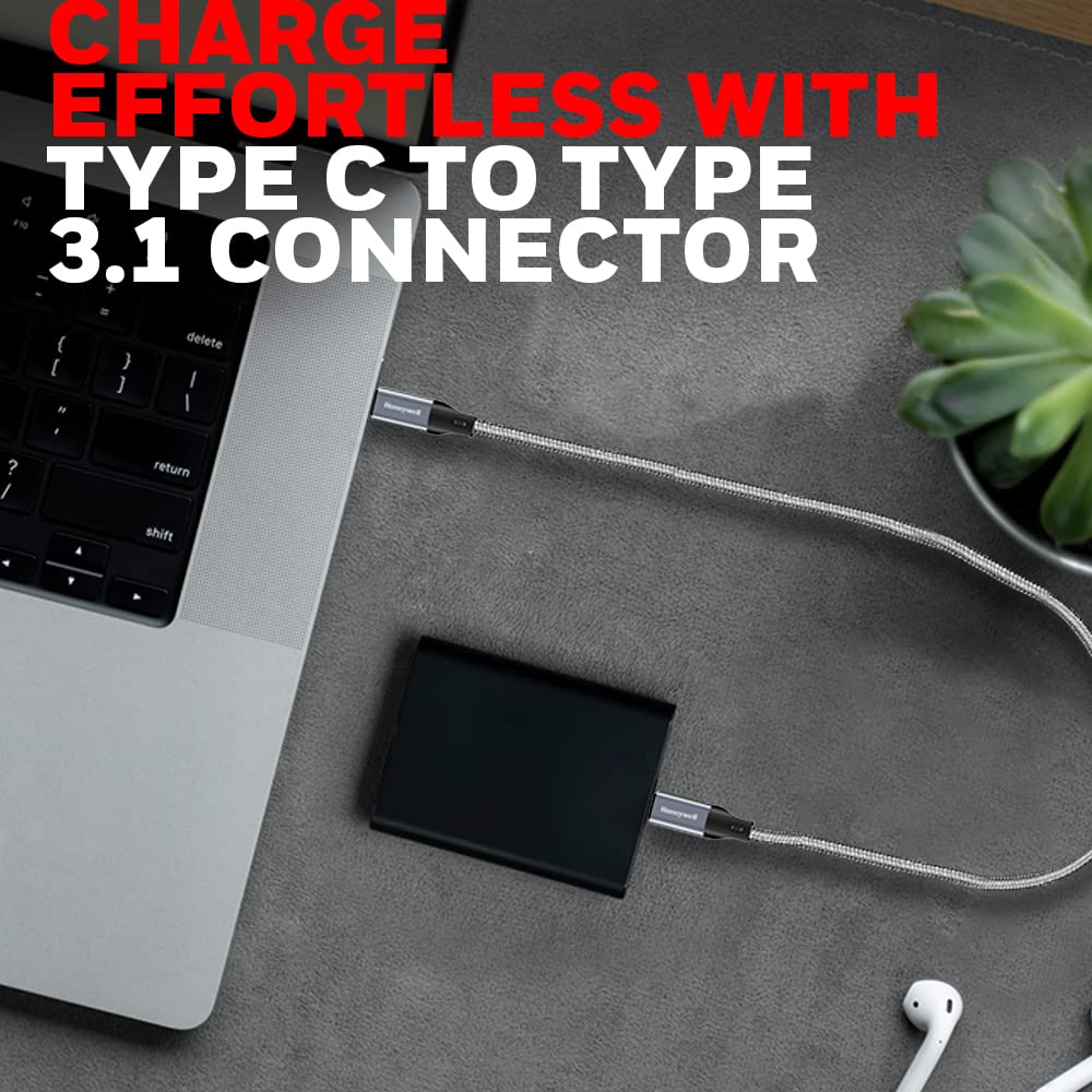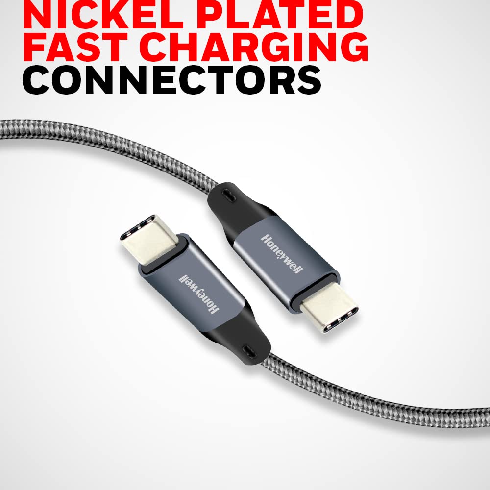Honeywell Type C to Type C, 4FT/1.2M Charge & Sync Cable—a sleek, durable solution for Type-C devices. With a 100W fast charging speed and Power Delivery (PD) support, it keeps your devices powered up. Tested to endure over 10,000 bends, it’s built tough. Compatible with laptops and all Type-C devices, it ensures swift data transmission at speeds of up to 5GBPS. Backed by a 1-year warranty, it is reliable choice for Type-C charging and syncing.